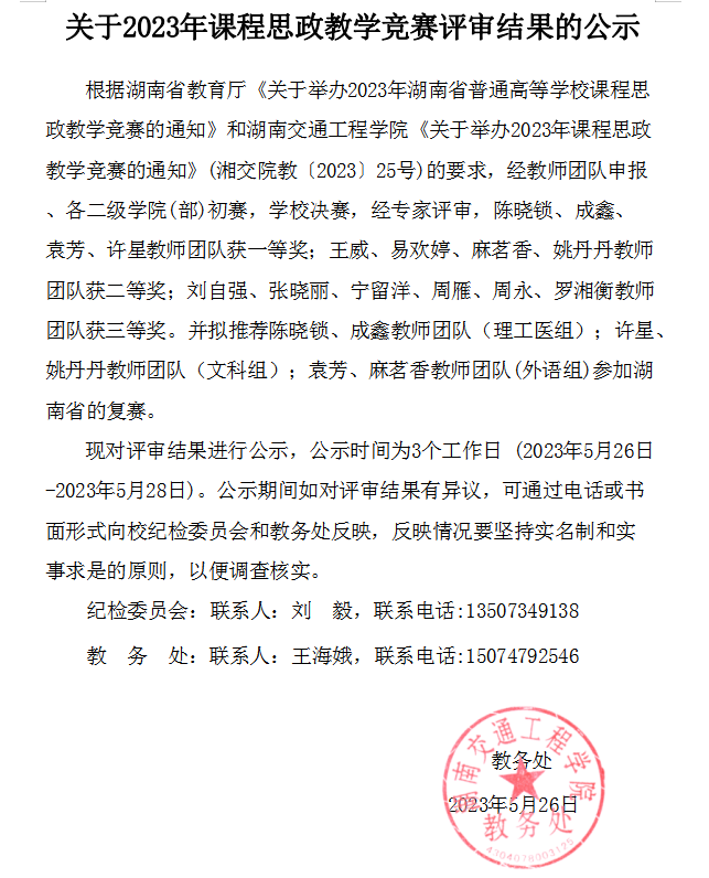 (转)关于2023年课程思政教学竞赛评审结果的公示