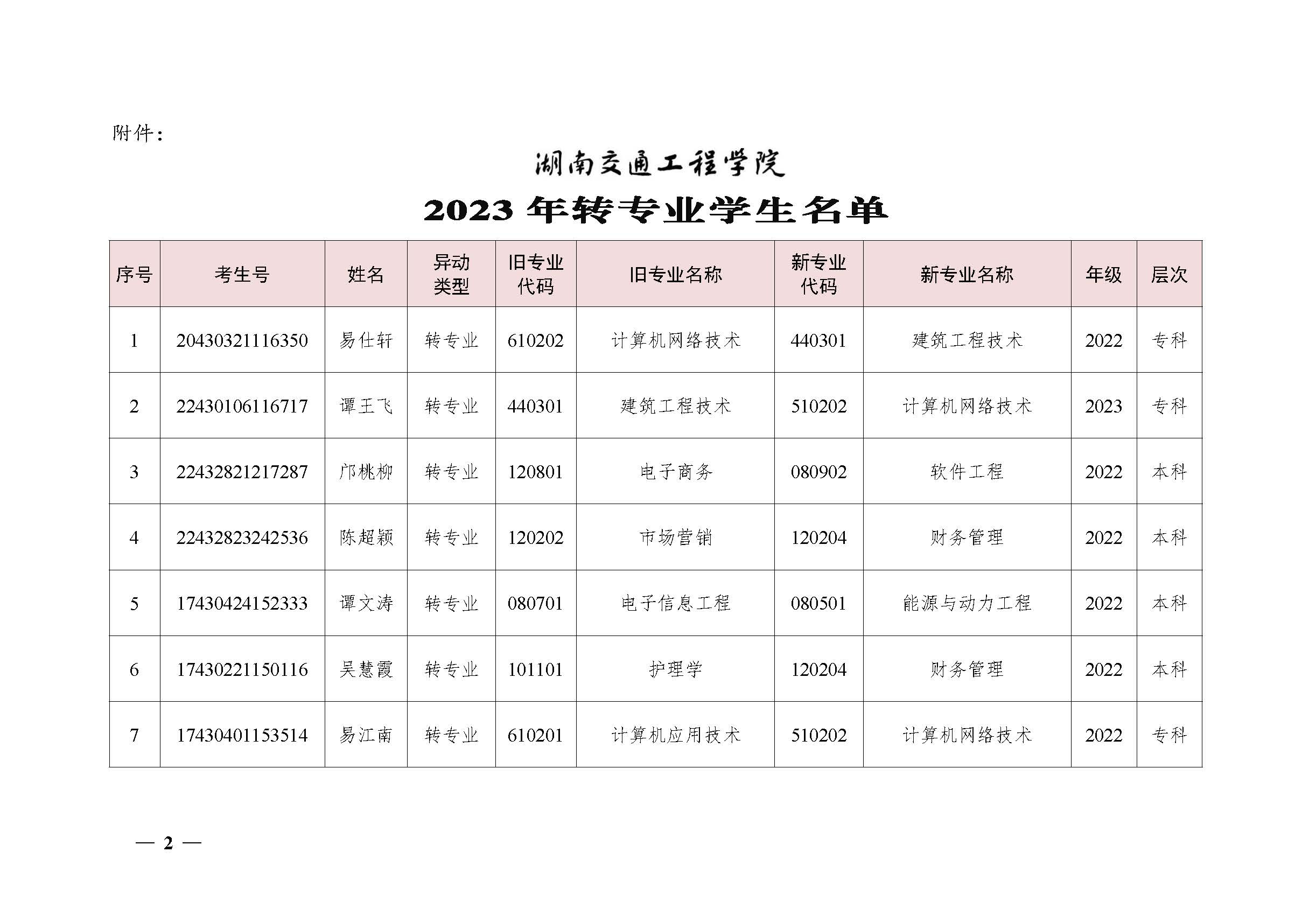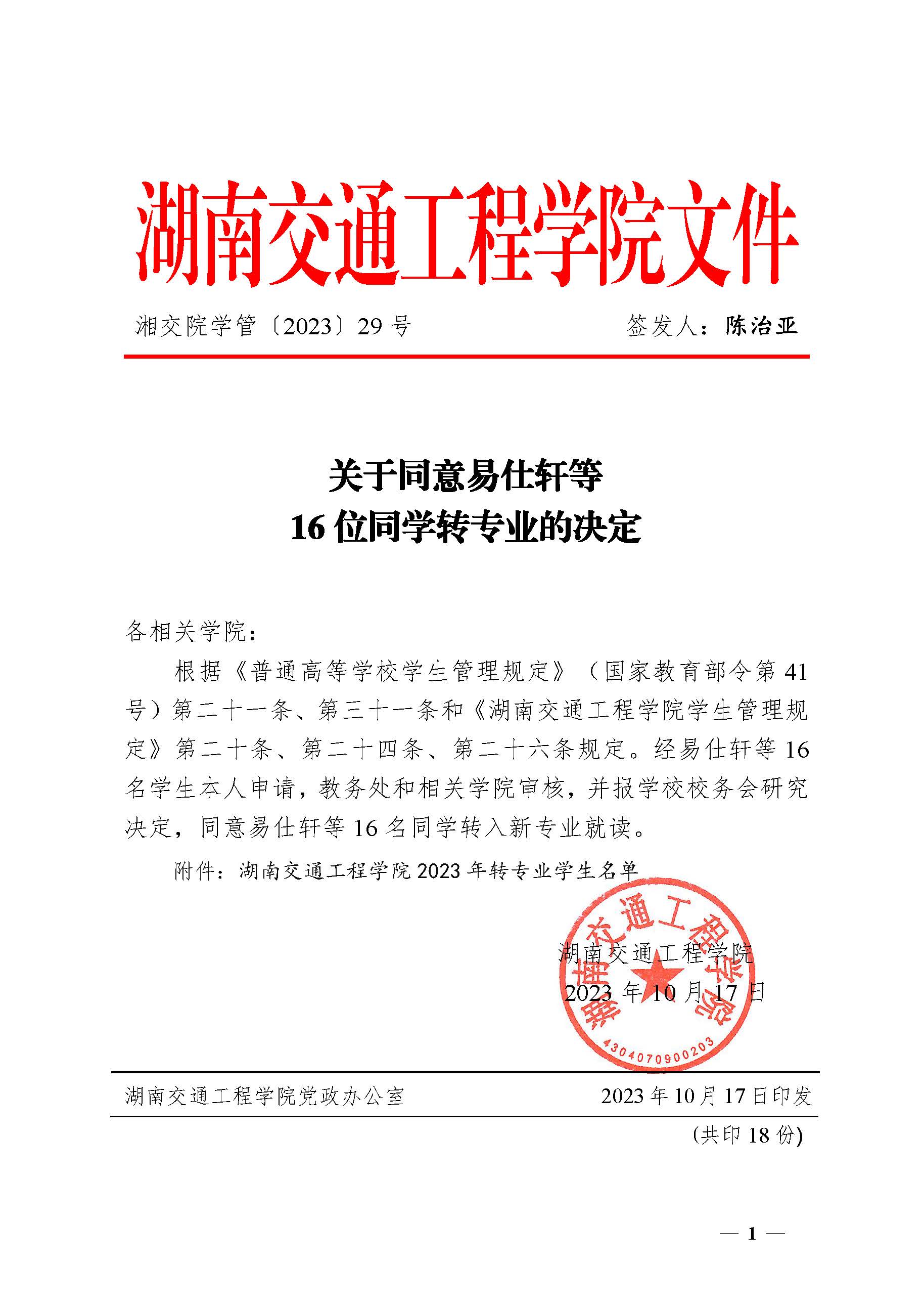 关于同意易仕轩等16位同学转专业的决定(湘交院学管〔2023〕29号)