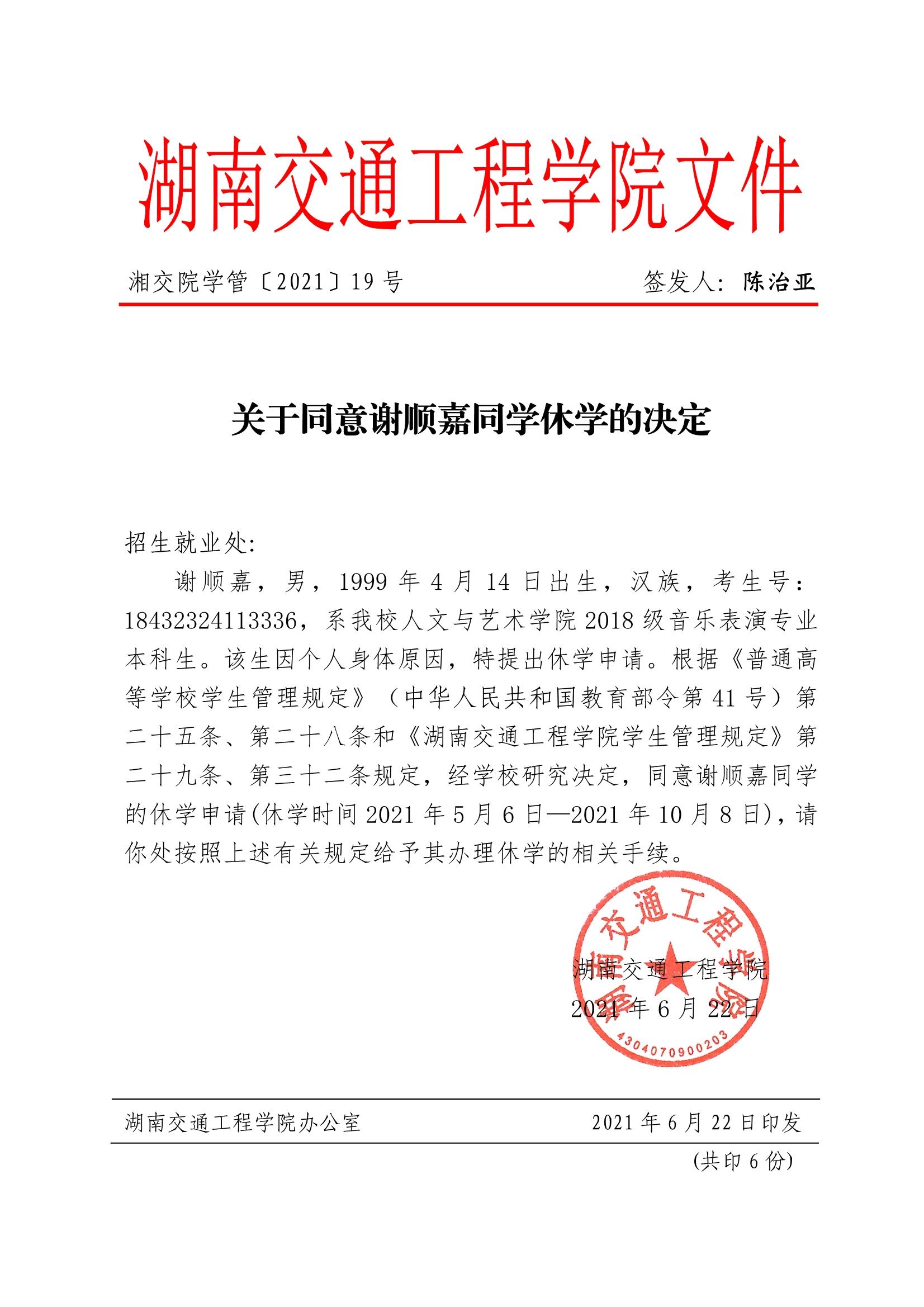关于同意谢顺嘉同学休学的决定(湘交院学管〔2021〕19号)