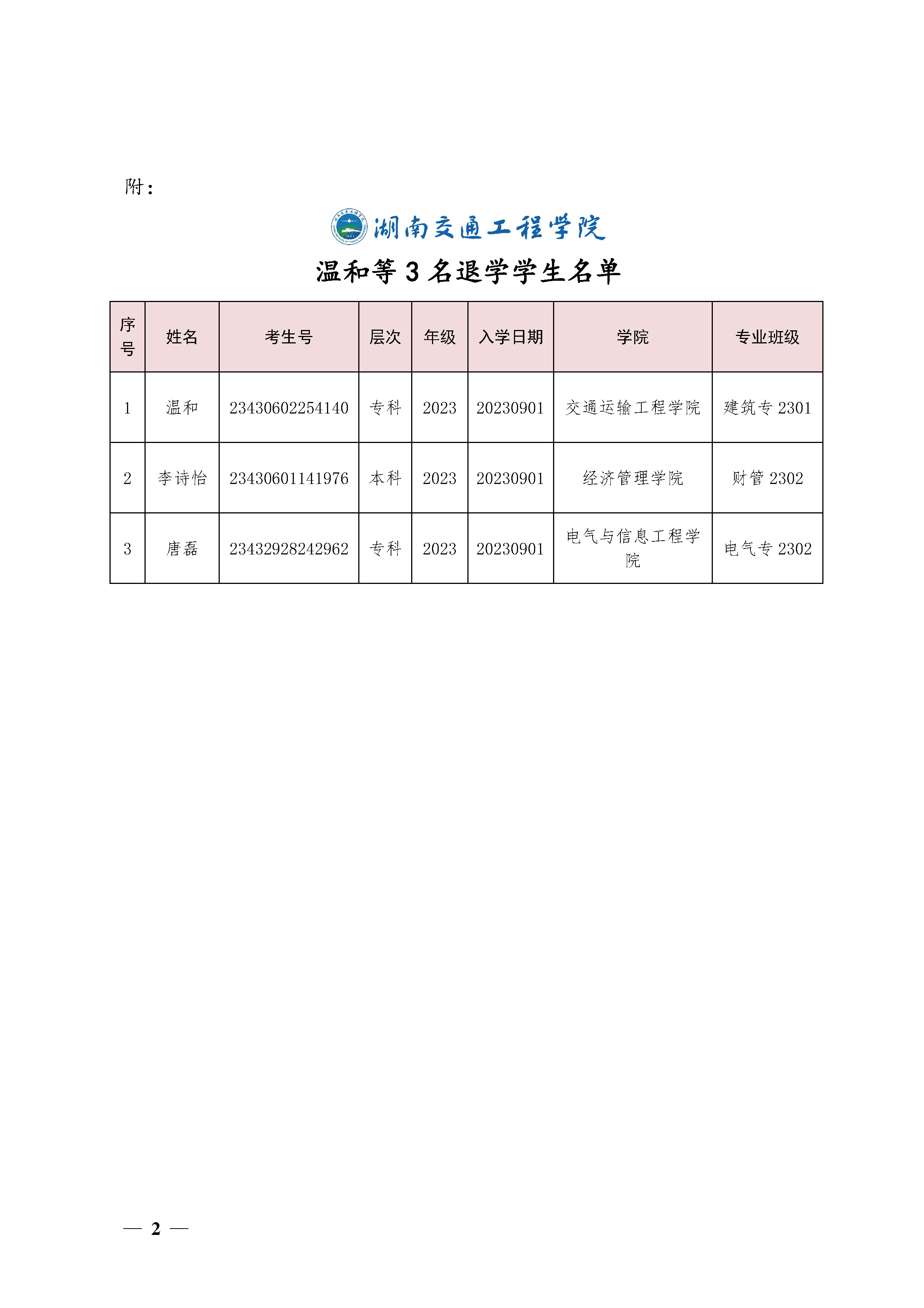 关于同意温和等3位同学退学的决定(湘交院学管〔2023〕34号)