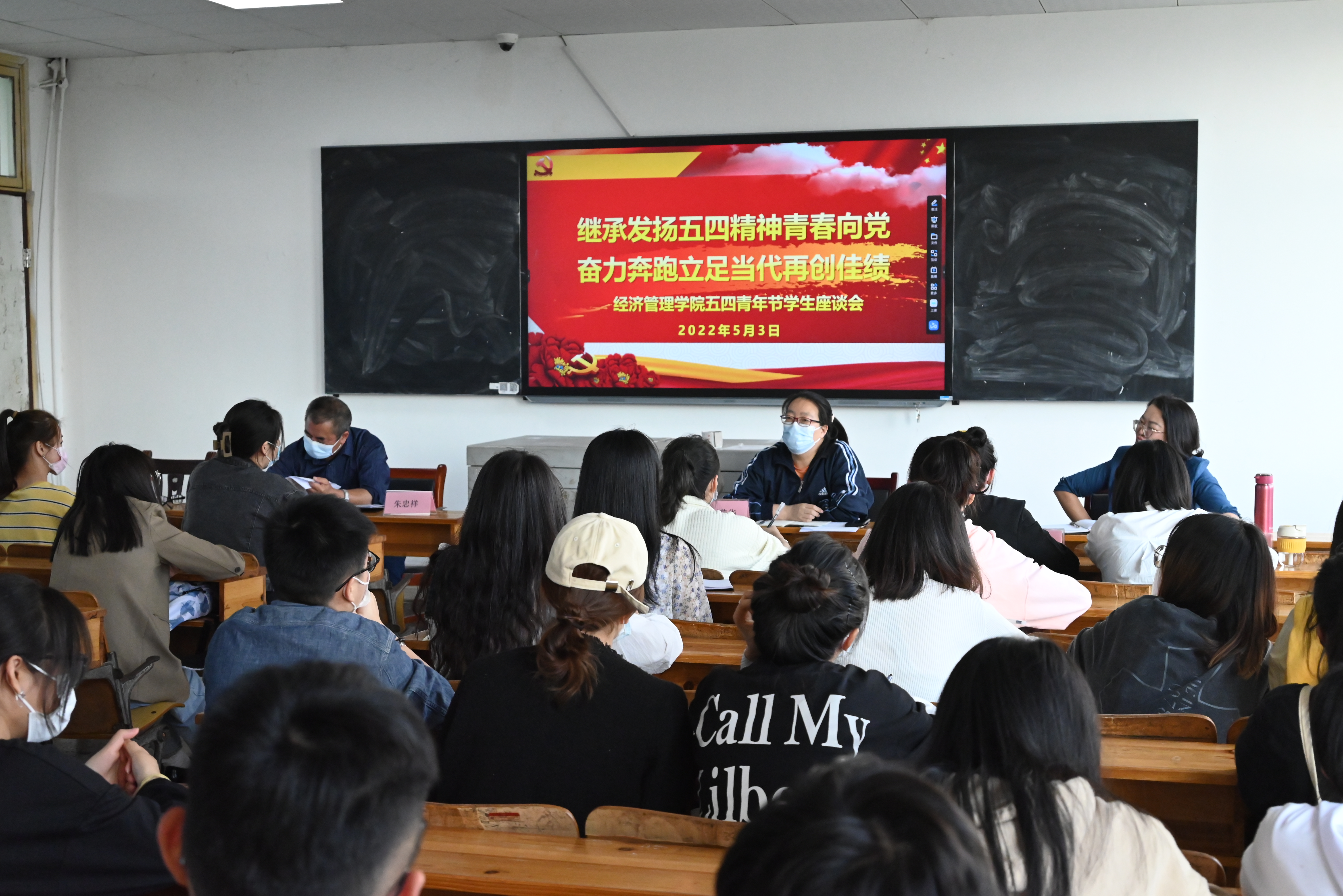 2022年5月3日下午17:00点,经济管理学院召开学生座谈会,各班学生代表及辅导员老师40人参加了座谈会,经济管理学院党总支书记赵荣华副教授、院长朱忠祥教授、副院长王冰副教授、学生党支部书记李燕丽出席座谈会并与学生现场交流。学生党支部书记李燕丽主持会议。