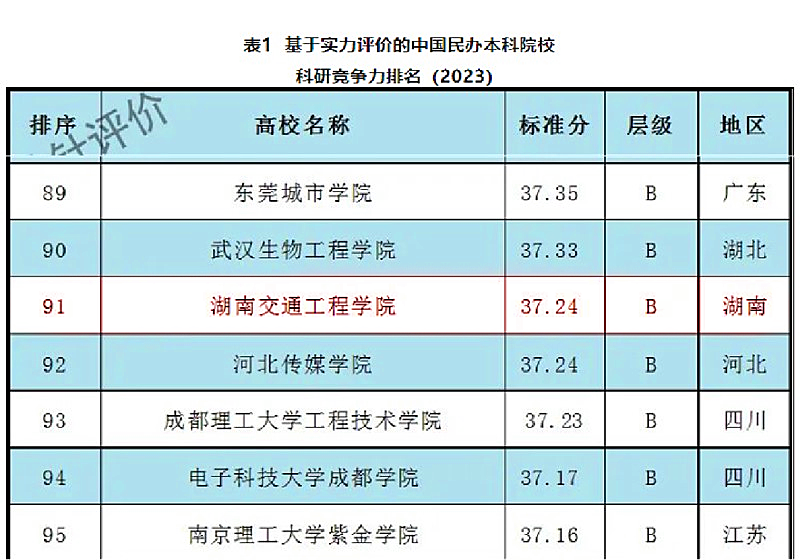 2023基于实力评价的中国民办本科院校科研竞争力排名C+级及以上(前50%)的高校共193所,18新利在线登陆 继2022年竞争力入选A级排名100的基础上,以37.24分(标准分100分)入选B级,位居实力评价科研竞争力排名C+级及以上的193所民办本科院校和独立学院第91位,较上一年排名进位9名。