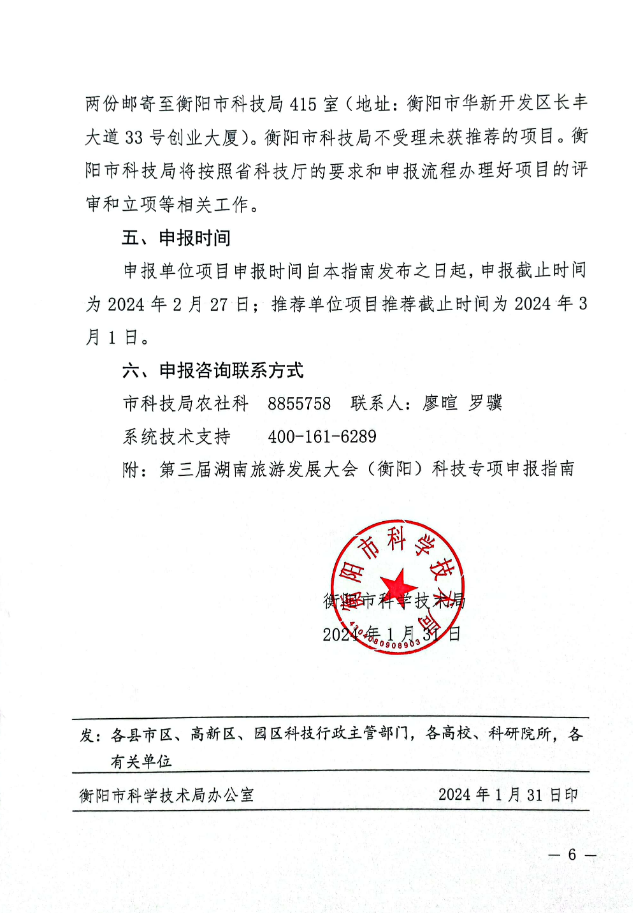 转发:第三届湖南旅游发展大会(衡阳)科技专项申报指南通知 来源: STB 发布时间:2024-02-22 浏览次数:[9844] 次 附件: 第三届湖南旅游发展大会(衡阳)科技专项申报指南通知.pdf 【打印正文】 上一篇: 关于申报2024年“芙蓉计划”——高校优秀思想政治工作者项目的通知 下一篇: 2024年度湖南省教育科学“十四五”规划课题推荐结果公示