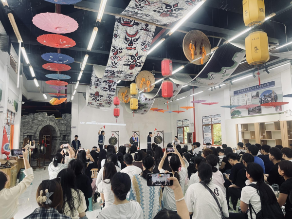 在高荡村布依族民俗陈列馆,师生们聆听了布依族民间艺人关于布依族歌舞艺术的介绍、现场学习了演奏布依族民族古老的打击乐器铜鼓。