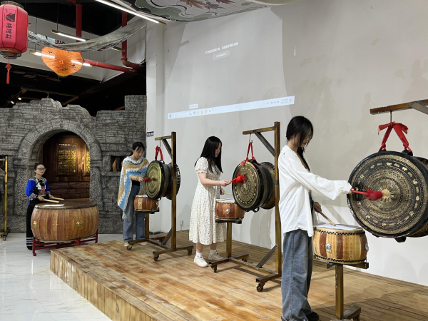 ▲同学们在学习演奏布依族铜鼓