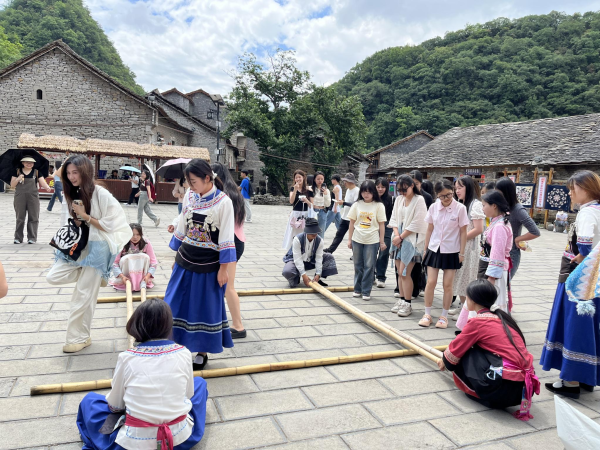 在高荡村布依族歌舞露天表演场,师生们现场观赏了高荡村布依族舞蹈表演,同学们体验表演了特色鲜明的布依族竹竿舞,“恰、恰恰……”伴随着欢快的韵律,竹竿互相敲击,参与体验的同学们跟随着表演者的节拍,在竹竿开合间敏捷地进退跳跃,欢声笑语在村寨回荡……