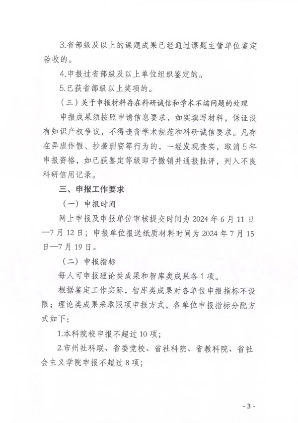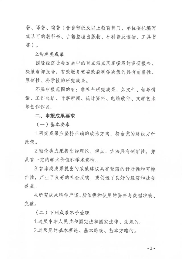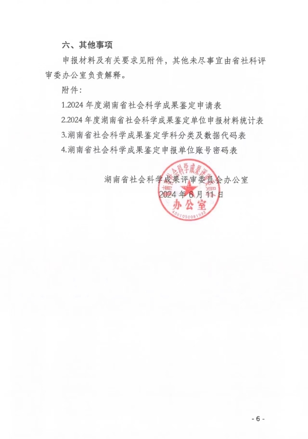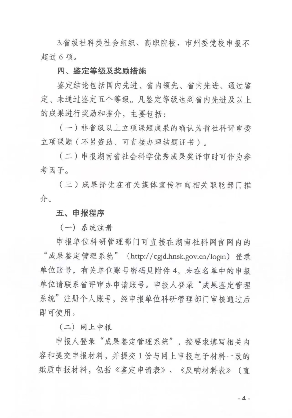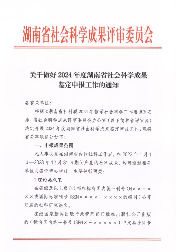 转发:关于做好2024年度湖南省社会科学成果鉴定申报工作的通知 来源: STB 发布时间:2024-06-13 浏览次数:[7206] 次 附件: 2024年度湖南省社会科学成果鉴定申请表.doc 2024年度湖南省社会科学成果鉴定单位申报材料统计表.xls 湖南省社会科学成果鉴定学科分类及数据代码表.doc 【打印正文】 上一篇: 转发:关于申报2024年度衡阳市指导性计划项目的通知 下一篇: 关于组织申报2024年度衡阳市知识产权专项项目的通知