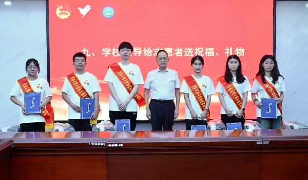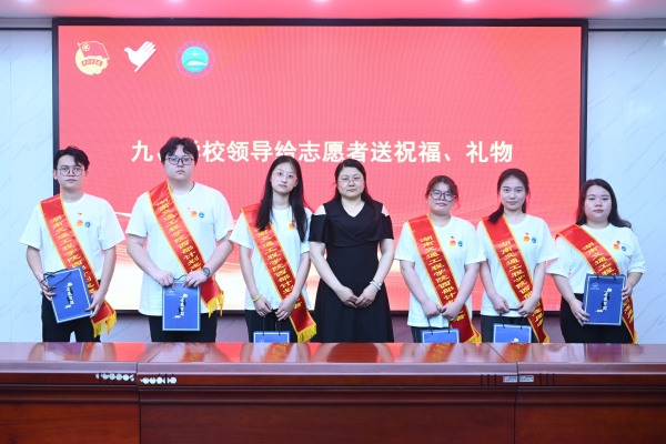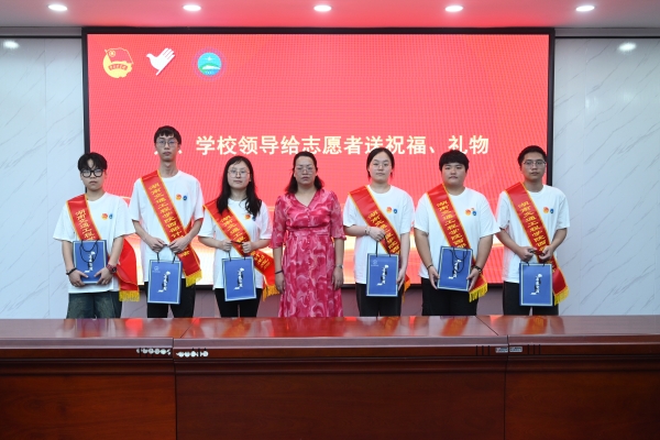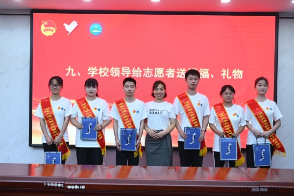 最后,余孟辉、漆在林以及医学技朮与护理学院党总支副书记刘建军、交通运输工程学院党总支副书记肖桂香、电气与信息学院党总支副书记李燕丽、机电工程学院党总支副书记辛敬凤、经济管理学院党总支副书记张敬会分别为谭福玲、杨佩颖等66位志愿者一一佩戴绶带,赠送学校纪念品并合影留念。