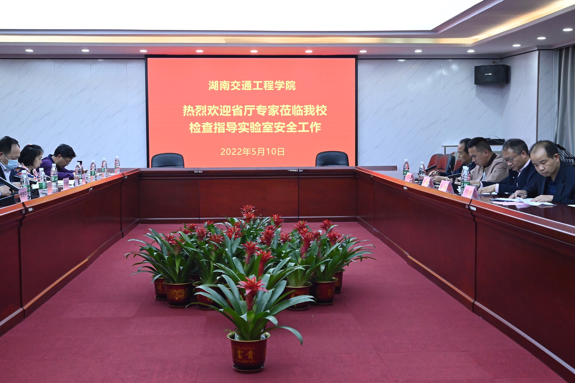 本网讯(记者 摄影 赵红深)5月10日下午,以中南大学张斗为组长,湖南科技学院孙明、湖南理工学院严权峰、长沙师范学院罗爱军为专家组成的省教育厅2022年高校实验室安全现场检查专家组一行4人来我校开展科研实验室安全检查。我校常务副校长彭文武,副校长樊晓平、余孟辉出席汇报会,教务处、设备处等相关职能部门及各二级学院(部)负责人参加会议,汇报会由樊晓平主持。