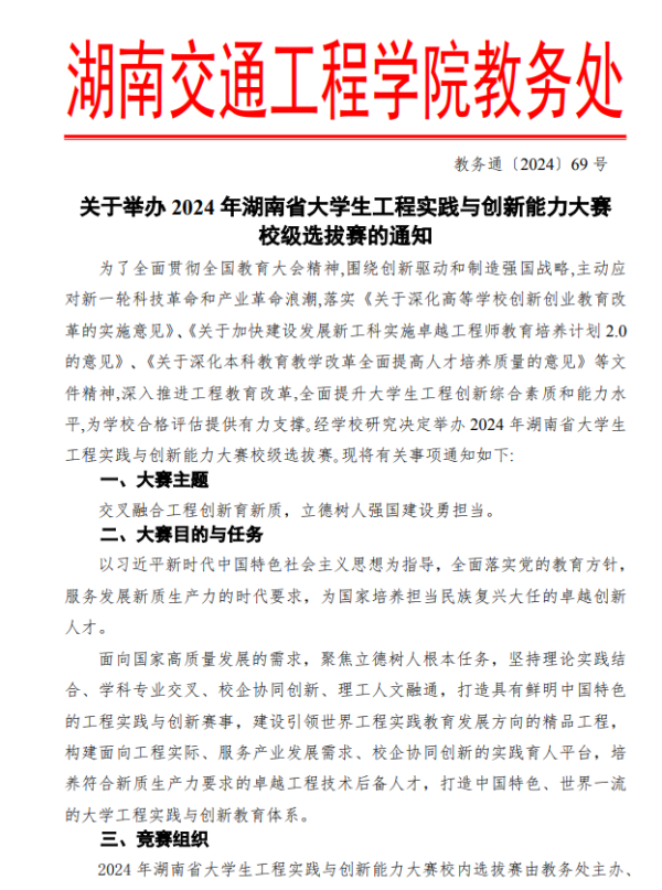 关于举办2024年湖南省大学生工程实践与创新能力大赛校级选拔赛的通知及附件