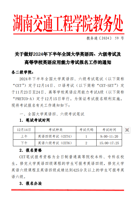 关于做好2024年下半年全国大学英语四、六级考试及 高等学校英语应用能力考试报名工作的通知