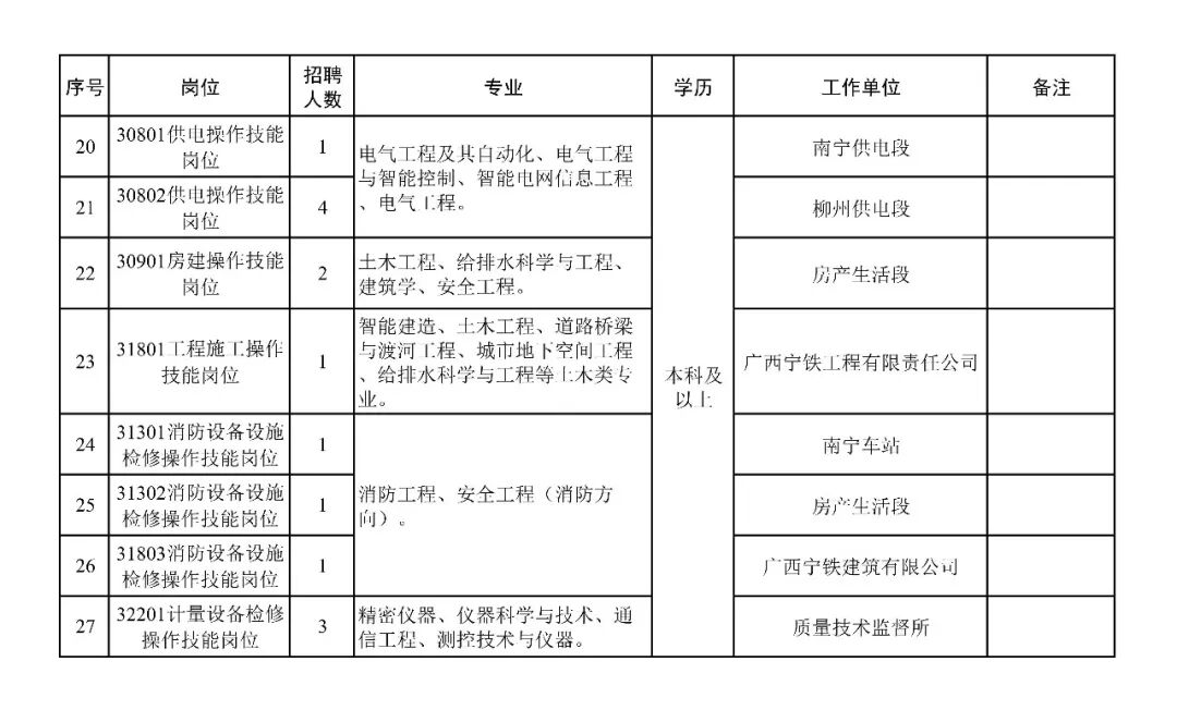 本次计划招聘58人,具体招聘岗位、专业、人数详见附件《中国铁路南宁局集团有限公司招聘2025年高校毕业生公告三岗位列表》。