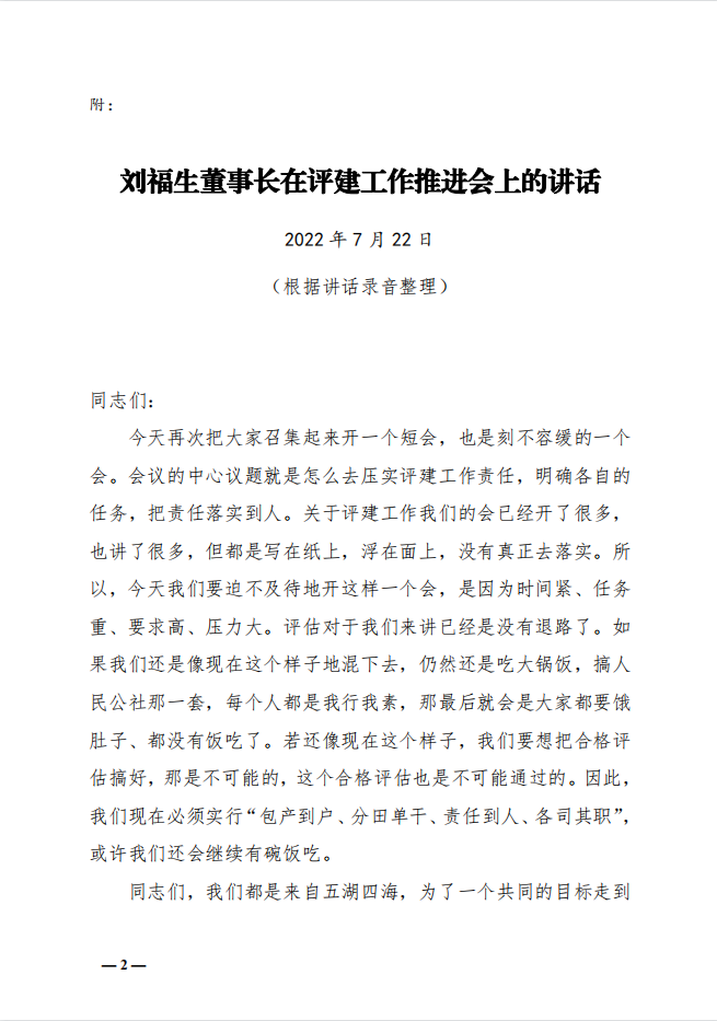 关于印发《刘福生董事长在评建工作推进会上的讲话》的通知