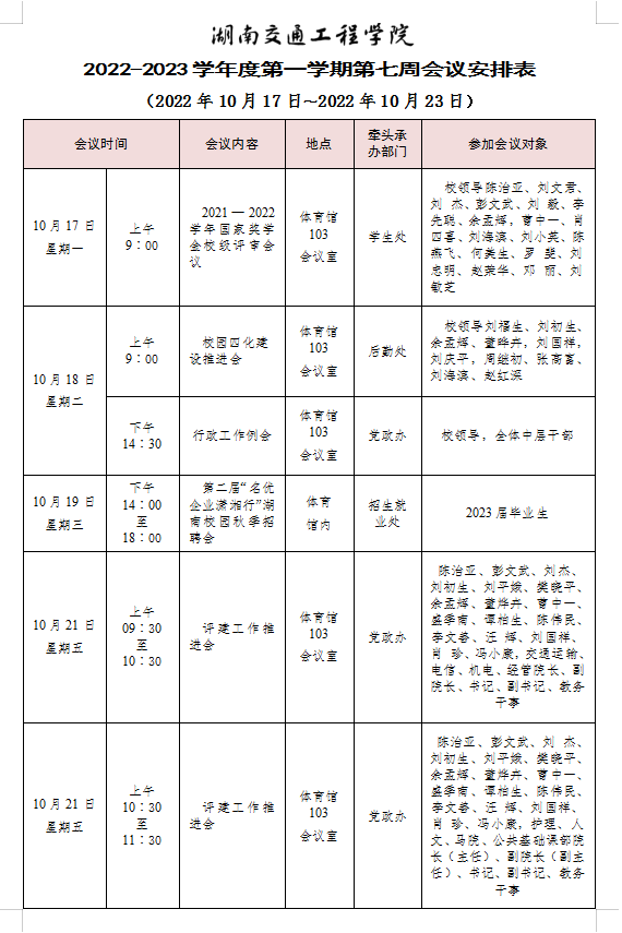 18新利在线登陆 2022-2023学年度第一学期第七周会议安排表