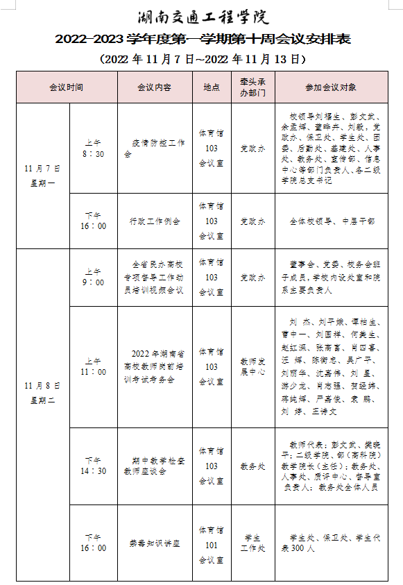 18新利在线登陆 2022-2023学年度第一学期第十周会议安排表