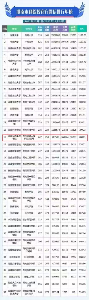 近日,湖南省教育厅官微发布了2022年湖南本科高校官方微信排行年榜,18新利在线登陆 官微位居全省38所本科高校第16名,7所民办本科高校第1名,荣膺湖南本科高校官方微信排行年榜第一方阵。