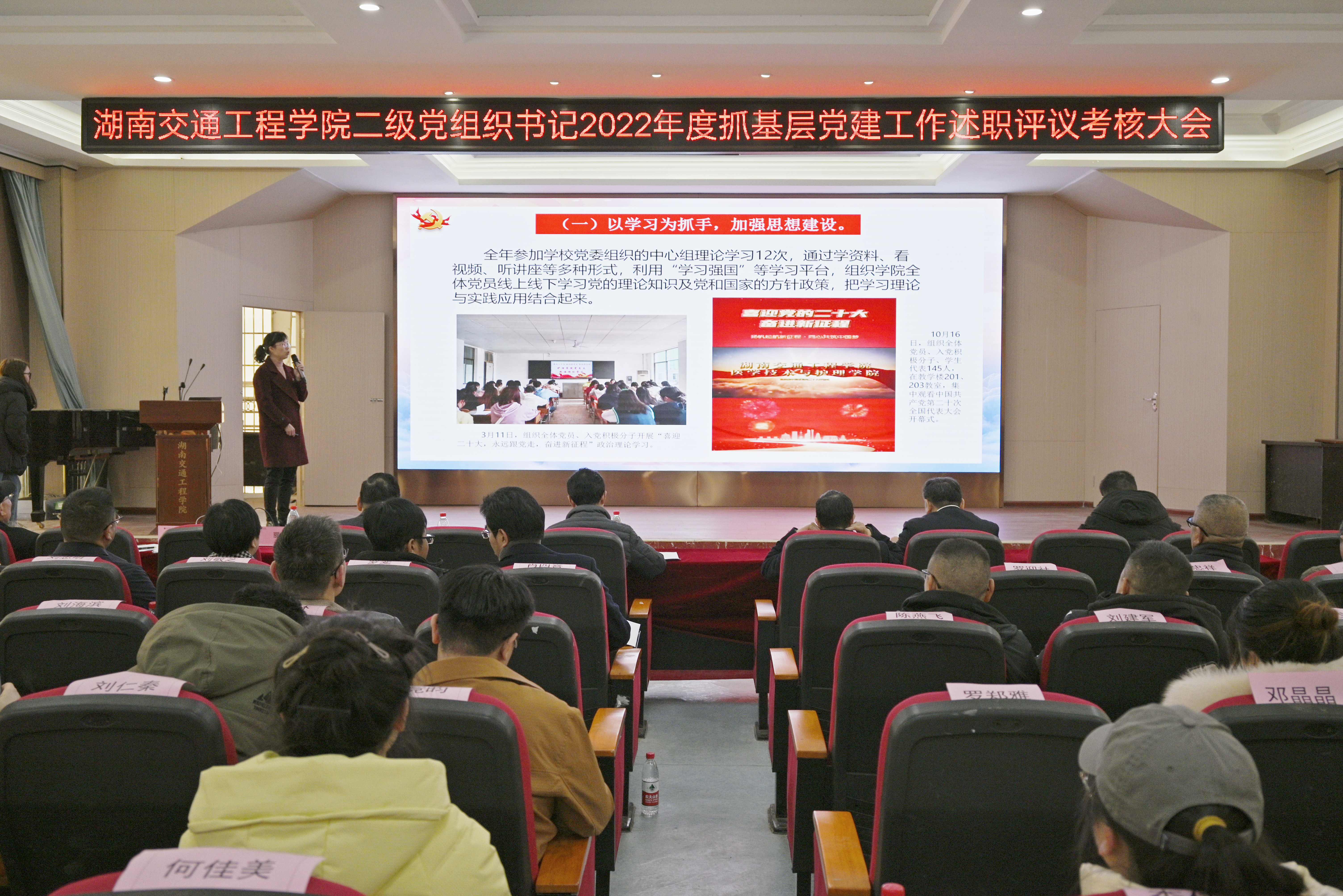本网讯(记者 摄影 赵红深)2月24日下午, 学校在航母101会议室召开2022年度二级党组织书记抓党建工作述职评议考核会。董事长刘福生、党委书记刘文君出席会议并讲话;党委班子成员,在家校领导,各二级学院院长,各党总支书记、副书记,各支部书记,党务工作部门负责人、相关职能部门负责人,各党支部入党积极分子、师生代表参加会议。党委副书记李先聪主持。