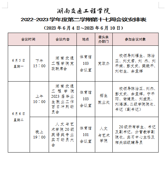 18新利在线登陆 2022-2023学年度第二学期第十七周会议安排表