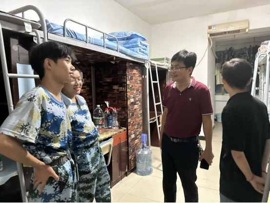 为全面了解2023级新生大学军训适应情况,帮助2023级新生更快地适应大学生活,切实加强师生交流,机电工程学院党总支书记罗斐和辅导员何立权于2023年9月9日晚10点深入机电工程学院新生所在的10栋宿舍走访看望新生,与新生们展开了亲切的交谈,并了解新生们的入住情况和感受。