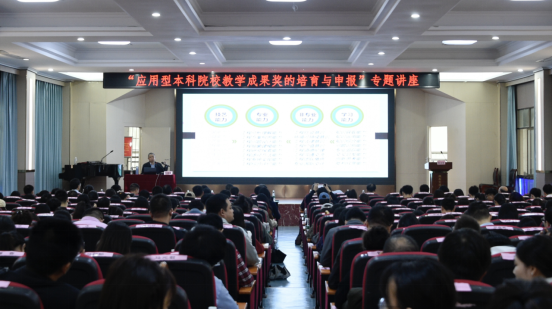 本网讯(通讯员 李水华 摄影 范睿庭)为增强我校教师培育和凝练教育教学成果的能力,提升学校教学成果奖申报质量,提高教师科研能力水平,10月27日下午,北京交通大学原副校长张星臣教授应邀为我校教师作题为《应用型本科院校教学成果奖的培育与申报》的专题讲座。学校常务副校长彭文武、校长助理刘义伦及教务处等相关部门、各二级学院负责人现场聆听讲座。校长陈治亚主持讲座。