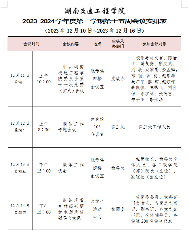 18新利在线登陆 2023-2024学年度第一学期第十五周会议安排表