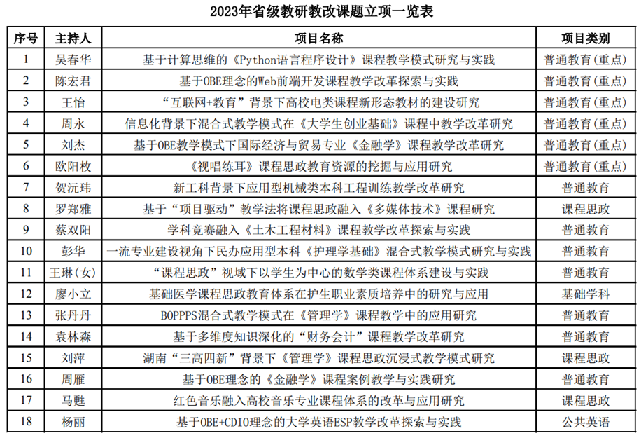 本网讯记者  赵红深  通讯员  肖湘龙常态教学促“第一课堂”质量提升,以学习研讨促“课堂革命”落实。2023年,我校进一步推进教育教学改革,以常规教研为基础,以听课、评课为切入点,积极探索教学模式与课程建设,实现提质增效目标,成效显著。年内教学改革项目省级立项18项,其中重点项目6项;经济管理学院以“完善高校学科特色发展分类评价”项目获湖南省深化新时代教育评价改革试点院系。