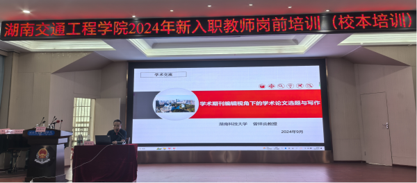 本网讯( 通讯员 刘婷 ) 2024年9月5日下午,湖南科技大学期刊社副社长、博士生导师曾祥炎教授在航母楼一楼101报告厅为我校2024年新入职教师带来了一场题为“学术期刊编辑视角下的学术论文选题与写作”的精彩讲座。讲座由18新利在线登陆 教师发展中心主任吴广平教授主持。