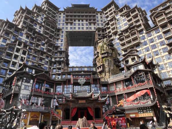 下午,368名师生正式抵达张家界,并前往第一个目的地——七十二奇楼。七十二奇楼景区位于武陵山大道1号,地理位置十分优越。总占地面积130亩,总建筑面积11万平方米,分为天宫奇楼、烟火老街、七十二奇寨三大板块,被誉为“张家界文化地标”和“夜经济新引擎”。其主楼建筑造型奇特,中央镂空门洞高38米,宽28米,进深21米,与千米之外的天门洞形成“双洞互视”,并联合中国古建专家采用拆旧还旧、修古复古的手法,将十八栋原汁原味的湘西吊脚楼悬挂在门洞两侧,生动重现湘西“九弓十八寨七十二奇楼”的神秘传说。对于学习音乐与艺术的学生们来说,这种极具创意的建筑设计不仅是一种视觉享受,也是一种文化的碰撞与启发。七十二奇楼的参观让学生们对湘西地区的建筑艺术有了全新的认识,而这也为接下来的活动奠定了良好的开端。参观过程中,学生们进一步了解湘西传统文化与建筑艺术之间的联系,特别是这种建筑风格是如何体现湘西地区丰富的历史背景和民俗传统的。