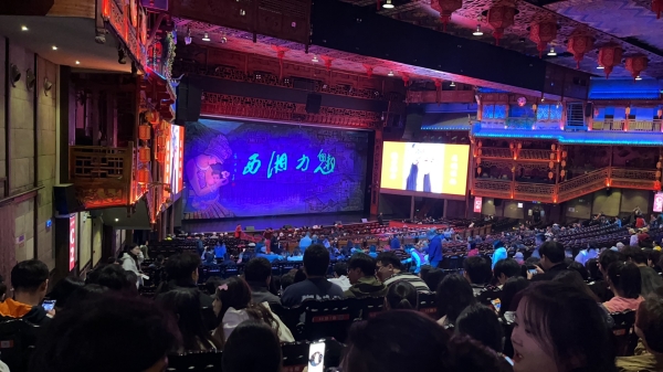 晚上,参加采风的全体师生一起观看了大型民俗艺术实景演出《魅力湘西》。这场大型演出通过舞蹈、音乐、戏剧等多种艺术形式,结合声、光、电的表演形式,呈现了一场原汁原味的湘西文化盛宴。自2000年演出以来,《魅力湘西》一直以其震撼的表演和精湛的制作质量吸引了众多观众,并被国家文化部列为“国家文化旅游重点项目名录”。该晚会不仅成为热情绽放、富含民族风情的歌舞盛会,更成为张家界文化旅游的一张金字招牌。《魅力湘西》的风情表演包括《苗族鼓舞》《边城》《爬楼》《茅古斯舞》《马桑树儿搭灯台》《女儿会》《哭嫁》《湘西赶尸》等节目。这些节目各具特色,展示了湘西多元的文化遗产。《苗族鼓舞》是湖南省湘西地区独特的舞蹈艺术,具有重要的文化保护价值。《边城》则根据沈从文的小说故事,唯美地表达了湘西儿女的情感。《爬楼》是广西金秀茶山瑶族的婚恋习俗,展现了瑶族自由恋爱的传统。《茅古斯舞》起源于土家族祭祀仪式,是一种具有宗教色彩的舞蹈。《马桑树儿搭灯台》是一首流行于湘西的男女二人对唱的红色民歌。《女儿会》则表现的是土家族的传统节日,展现了土家族女性的光辉。《哭嫁》通过哭唱的方式,深刻展示了新娘内心的复杂情感。《湘西赶尸》是将湘西特有的习俗搬上舞台,以猎奇探幽为主题,展现了湘西的地理和人文特色。除了以上表演,场外还有篝火演出、土家硬气功表演、湘西三大蛊迷巫术表演等项目。其中,《追爱》是一部原生态的爱情戏剧,因其独特的舞蹈和杂技融合,受到了广泛好评,被评为全国旅游文化重点项目和优秀作品。在观看表演的过程中,师生们深刻感受到湘西少数民族在文化传承中的不懈努力和创新精神。尤其是通过原生态的音乐与舞蹈表演,师生们进一步理解了民间艺术对于少数民族文化的重要性。