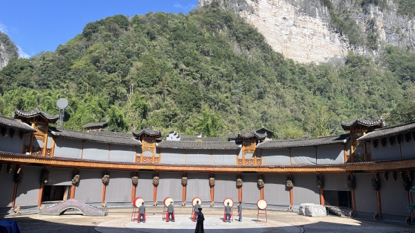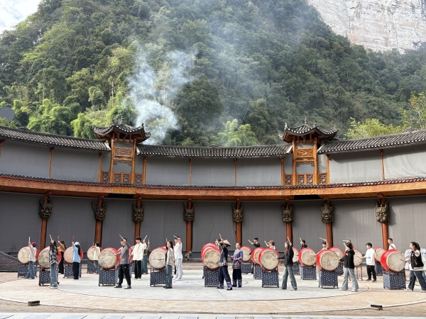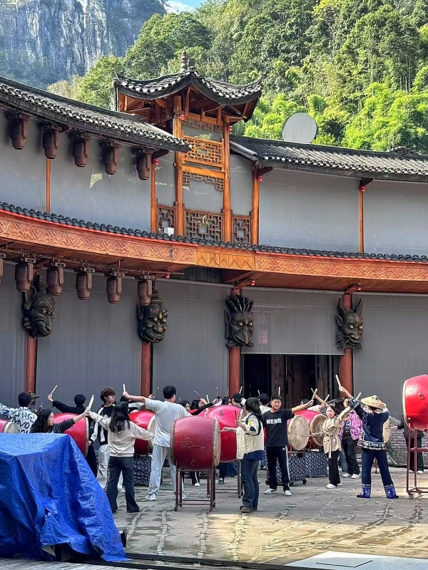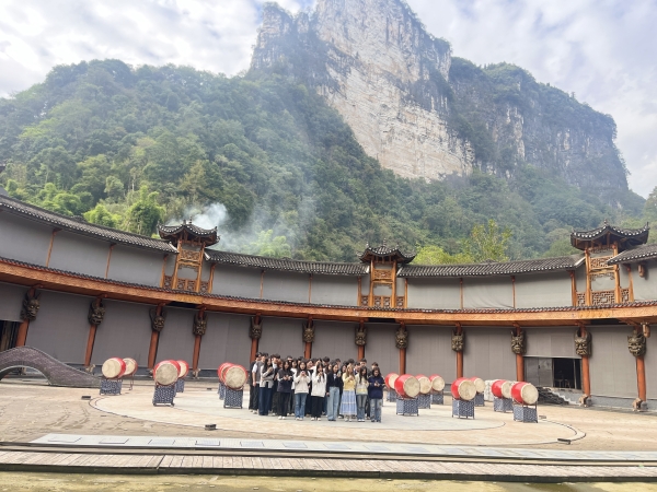 全体师生首先汇聚在德夯苗寨广场,欣赏了一场精彩纷呈的德夯苗鼓表演。德夯苗寨人人善于击鼓,有“天下鼓乡”之美誉,每年这里都要举办鼓文化节,全国各地的鼓队抵达德夯参赛,打得最好的被尊奉为鼓王。德夯苗族鼓乐最具有舞蹈特色,是音乐、舞蹈的完美结合。德夯苗鼓舞通过叙事性的表演方式,构成了湘西苗族鼓乐的独特个性,它通过一个个生动的舞蹈动作,再现了湘西苗族人民生活、劳动的场景,展现了精彩纷呈的湘西苗族历史画卷。苗族舞者们用优美的舞姿和流畅的动作展示了民族舞蹈的魅力,学生们无不为其独特的艺术表现形式所吸引。这不仅是一次艺术的享受,也是一次深刻的文化体验,让大家对苗族文化有了更直观的认识。在德夯苗寨鼓师的精心指导下,采风学生现场学习苗族鼓舞,从开始的不熟练到逐渐掌握节奏的规律,最终能够整齐划一地击打出苗鼓特有的韵律。这种通过肢体与声音融合的表现方式,不仅让学生们体会到了苗鼓的力量感,也增强了他们对节奏和音乐表达的理解。