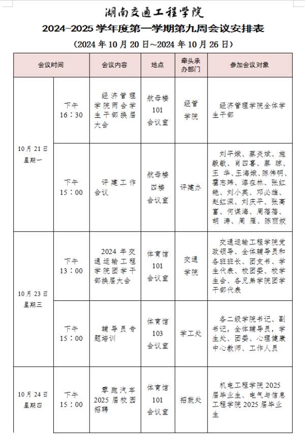 18新利在线登陆 2024-2025学年度第一学期第十周会议安排表