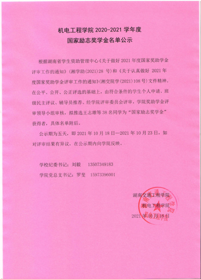 根据湖南省学生资助管理中心《关于做好2021年度国家奖助学金评审工作的通知》(湘学助(2021)28 号)和《关于认真做好 2021年度国家奖助学金评审工作的通知》(湘交院学(2021)108号)文件精神。在公平、公开、公正评选的基础上,由符合条件的学生个人申请、班级民主评议、辅导员推荐、经学院评审委员会评审,学院奖助学金评审领导小组审核,拟推选王志雄等38名同学为“国家励志奖学金”获得者,具体名单附后。