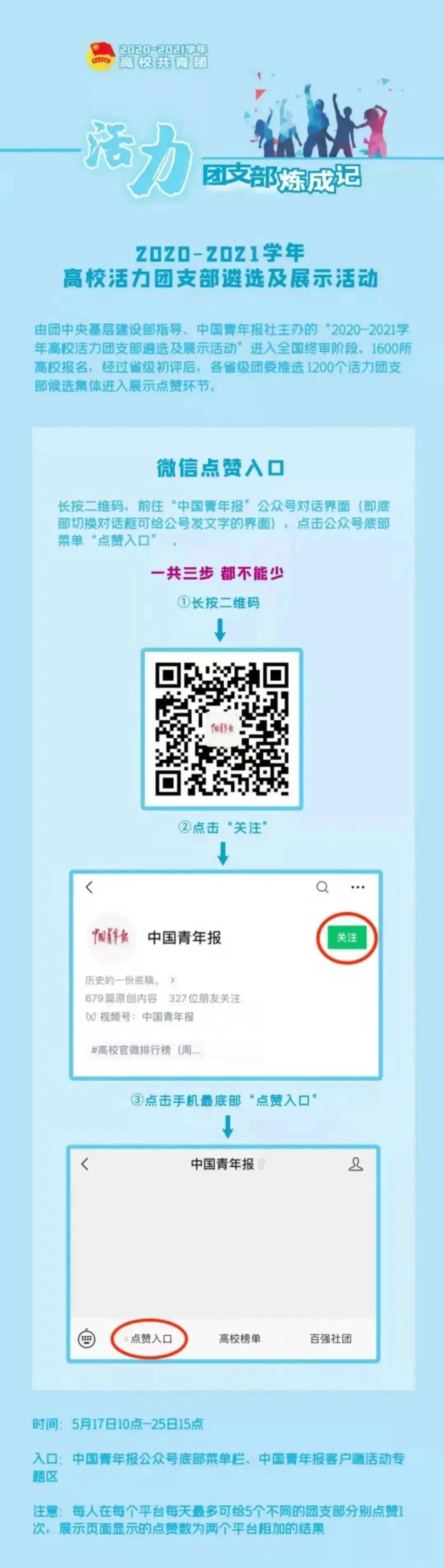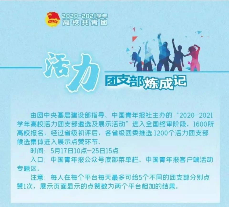 由团中央基层建设部指导、中国青年报社主办的“2020-2021学年高校活力团支部遴选及展示活动”进入全国终审阶段。1600所高校报名,经过省级初评后,各省级团委推选1200个活力团支部候选集体进入展示点赞环节。