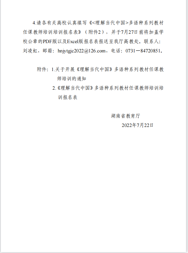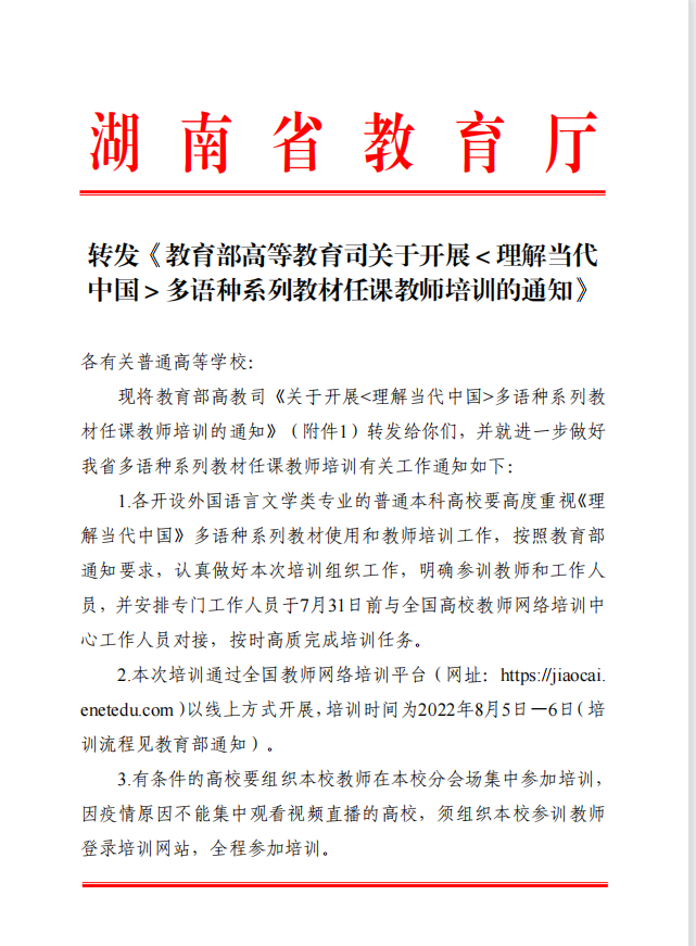 湖南省教育厅:转发《教育部高等教育司关于开展<理解当代中国>多语种系列教材任课教师培训的通知》