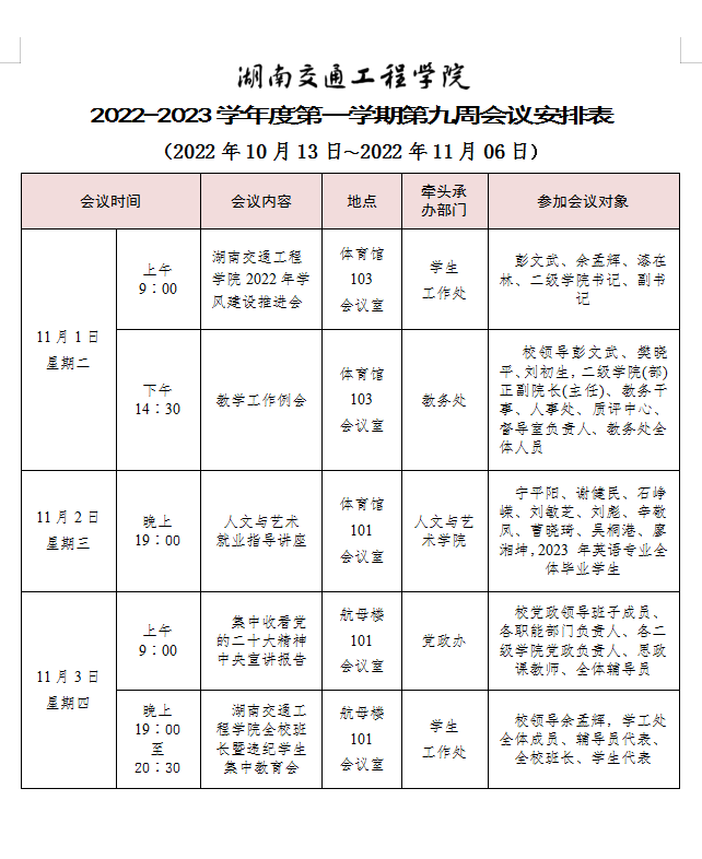 18新利在线登陆 2022-2023学年度第一学期第九周会议安排表