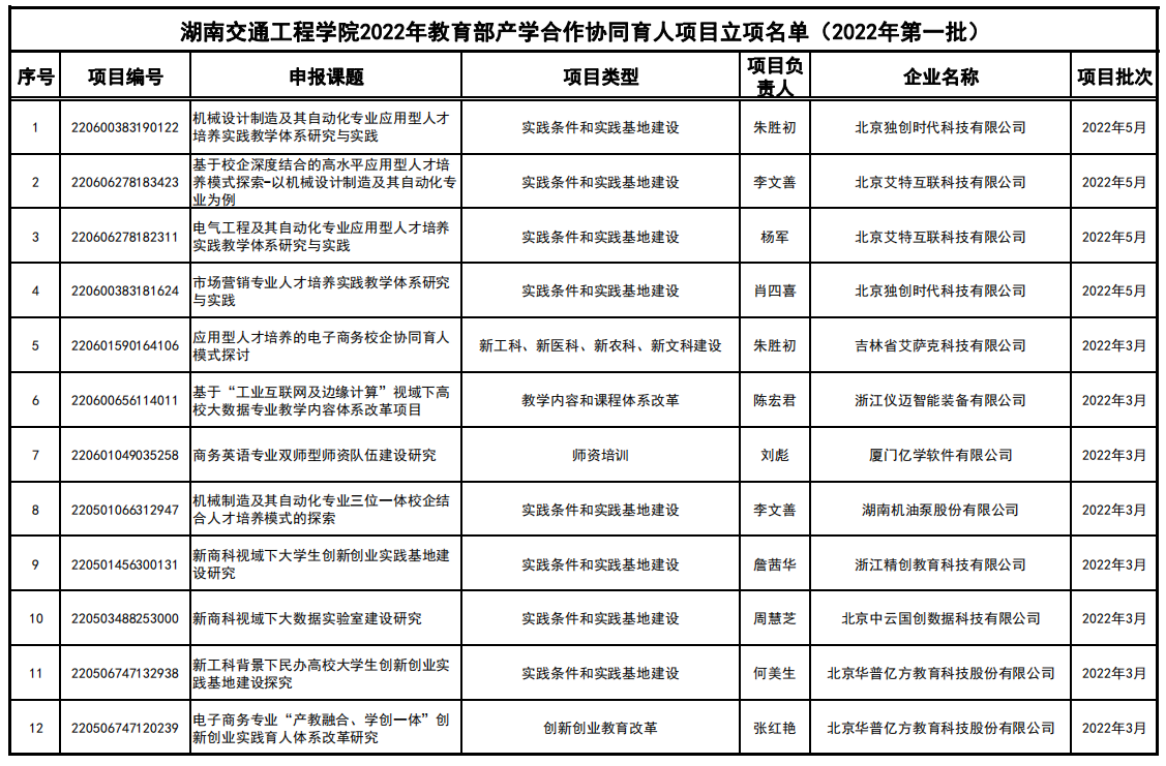 此次立项的12个项目获得了北京、吉林、浙江、厦门等12家知名企业的支持,项目涉及新工科建设、教学内容和课程体系改革、创新创业教育改革、师资培训、实践条件和实践基地建设,共同探索校企协同育人模式。截至日前,我校已获教育部产学合作协同育人项目累计38项。此外,学校积极组织2022年第二批产学合作协同育人项目申报,已推荐30多项新一批项目的申报。