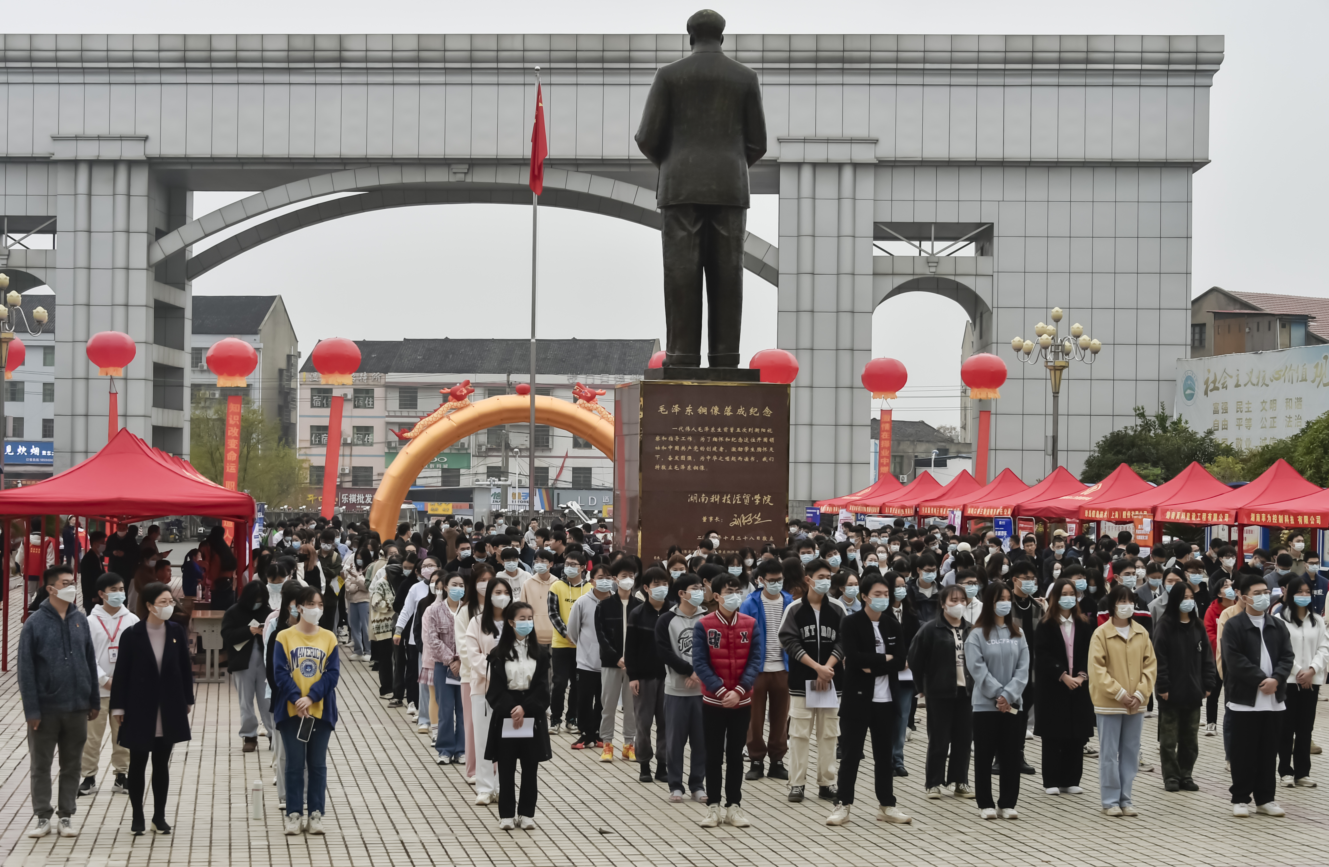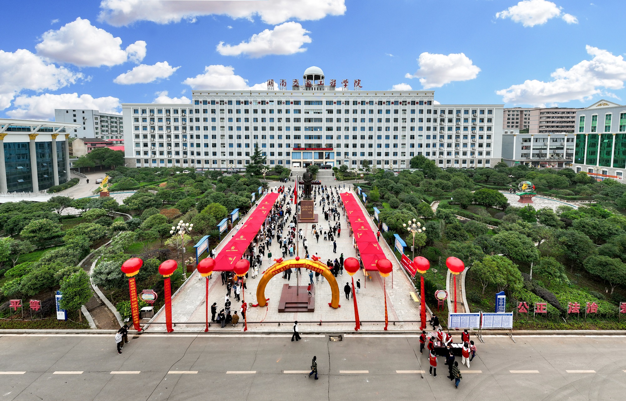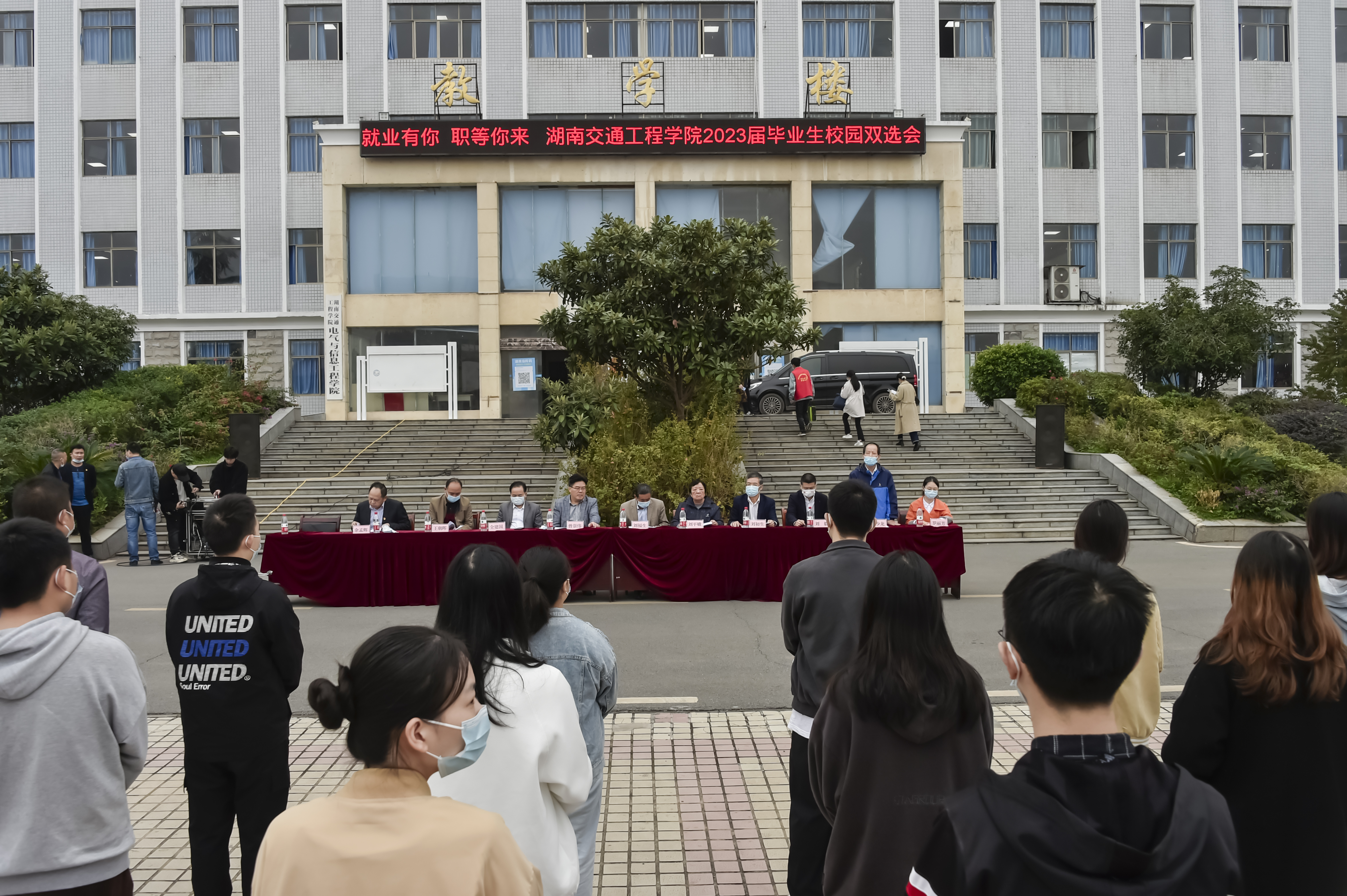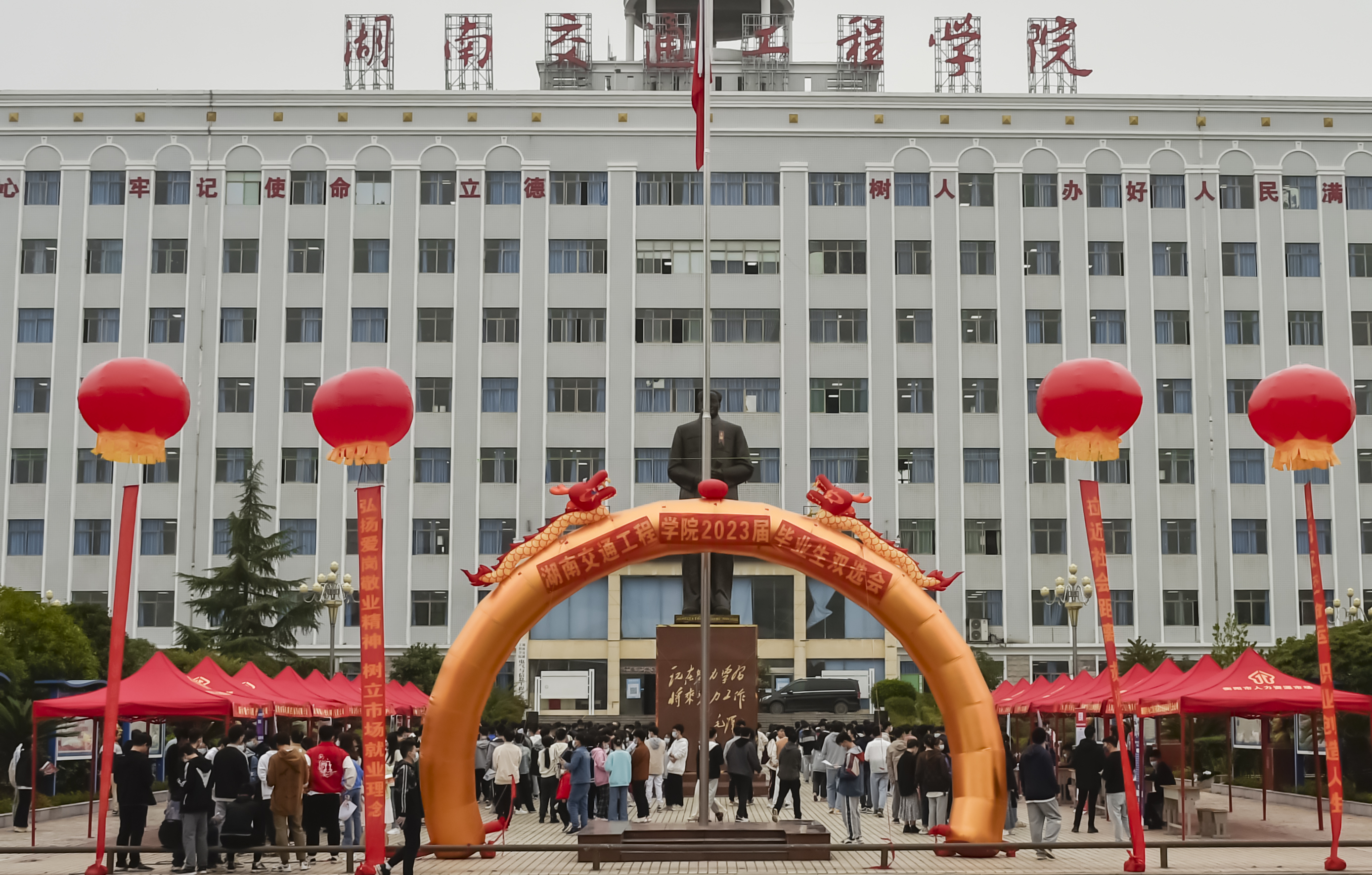 本网讯(通讯员 赵红深 摄影 李建华 航拍 奉隆源)初冬湘南天气好,可怜冬景似春华。11月26日上午,毛泽东铜像文化广场人头攒动,气氛热烈,我校2023届毕业生冬季就业双选会在此举行。上海同義科技、新疆特变电工、苏州华星光电、广东海悟、深圳国润等近100家用人单位来校揽才,累计为毕业生提供岗位4000余个,专业需求覆盖我校所有专业。衡阳市人社局副局长曾崇伟莅临双选会指导并讲话,董事长刘福生出席双选会开幕式。副校长余孟辉主持。