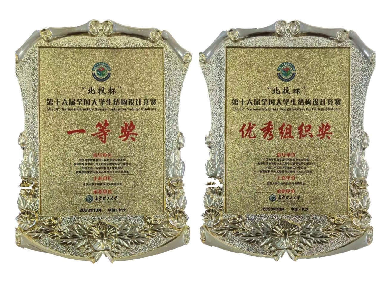 我院参赛师生秉着扎实肯干、吃苦耐劳、精于钻研、善于协作的工匠精神,不断升华理论知识, 践行实践创新。在学校、学院的高度重视与大力支持下,自今年3月份发布赛题以来,学院成立指导老师团队,多次集体研究赛题,精心组织校赛和省赛,悉心开展集训,于7月份夺得省赛一等奖,凭借省分区赛一等奖成绩。8月份省赛秘书办通知获得国赛入场资格后,指导教师继续带领参赛选手,接近三个月备赛期几乎全程无休,从模型结构形式到每一个结点细节处理,都经过无数次反复尝试、改进、创新,最终参赛团队历时16.5个小时现场制作两跨四车道模型《凌霄桥》,凭借巧妙的作品设计、精湛的制作工艺、突出的结构性能、稳定的现场发挥,以自重129.5g、承受住三级多工况竖向移动荷载、撞击荷载的优异成绩取得国家一等奖,被组委会授予优秀组织奖。