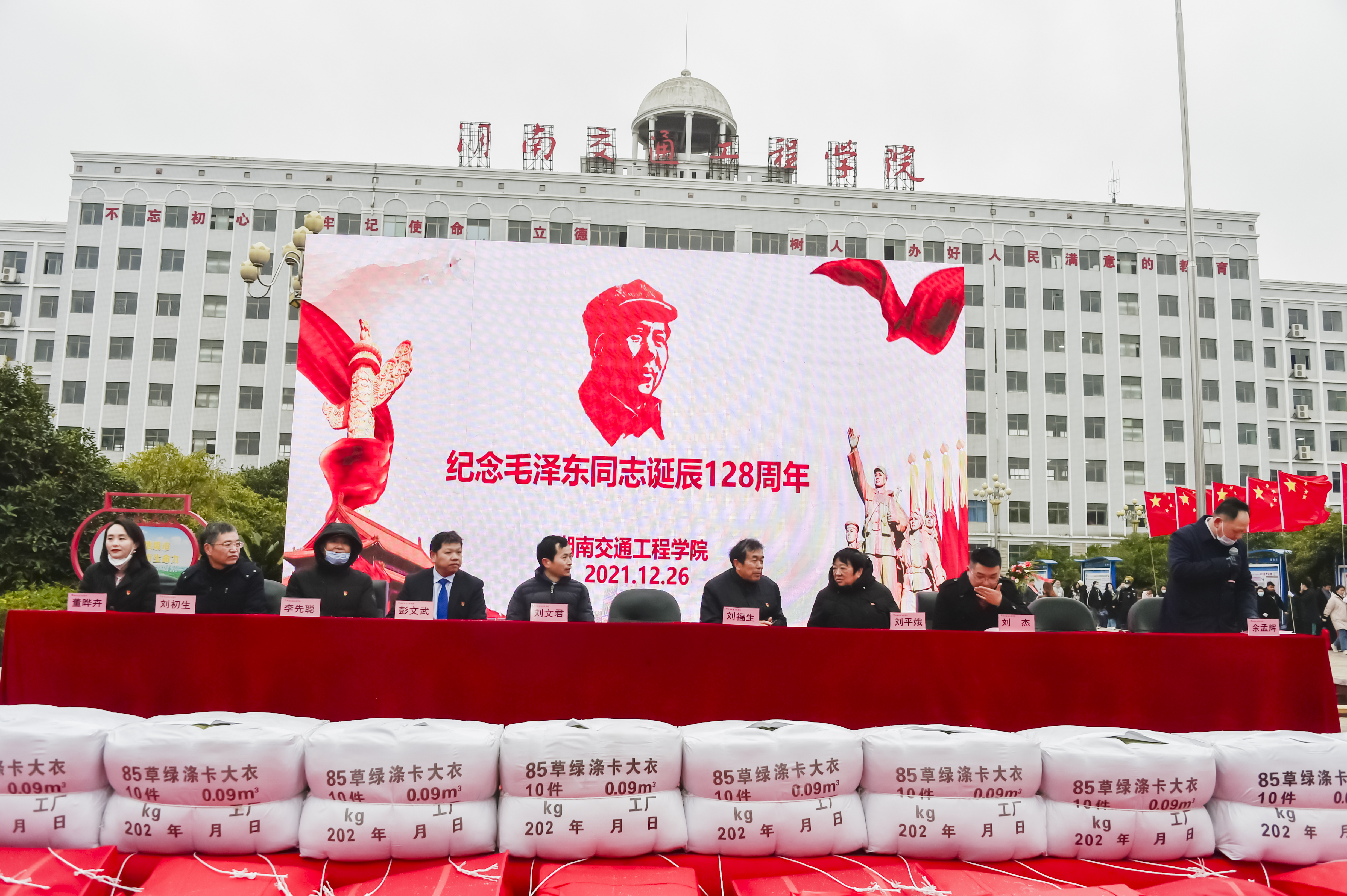 随着《爱的奉献》音乐的响起,受助学生排起了领助棉衣棉被的长龙队伍,为纪念毛泽东同志诞辰128周年纪念活动增添了爱的氛围和社会情怀场景董事长刘福生、党委书记刘文君、执行校长刘杰、名誉校长刘平娥、党委副书记李先聪、常务副校长彭文武、副校长刘初生、余孟辉,校董事董晔卉等校领导为受助学生一一发放棉衣棉被。