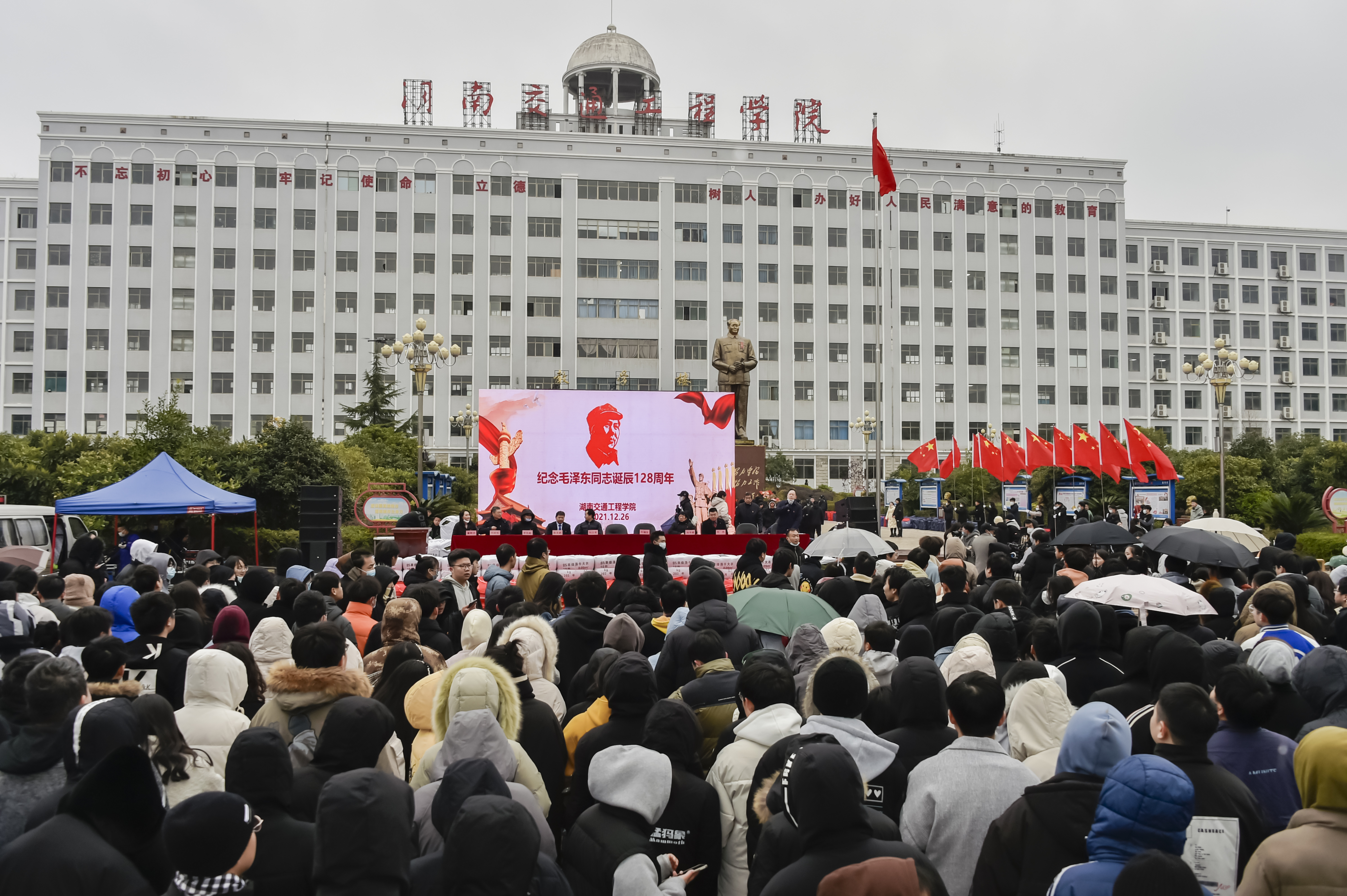 本网讯(记者 赵红深  实习记者 胡家怡  何奕玲 干子豪  摄影 李建华  刘释成12月26日,是毛泽东同志诞辰128周年纪念日。上午,2000余名师生在教学楼前毛泽东铜像广场隆重集会,举行纪念毛泽东同志诞辰128周年敬献花篮大型纪念活动和董事长刘福生第31次为贫困学生发放棉被棉衣捐赠活动。