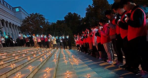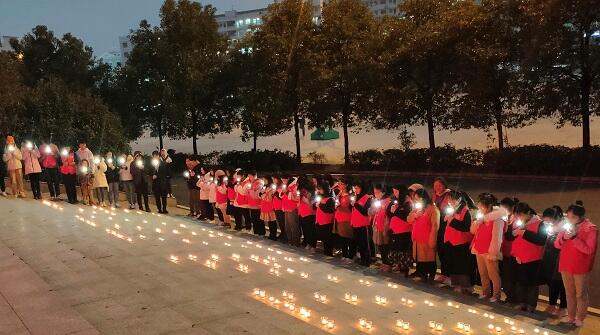大学生举办为“艾”发光活动,用烛光点亮“NO AIDS”和红丝带的字样和图案,呼吁广大青年知艾防艾,共享健康。