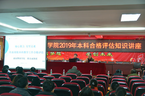 本网讯(通讯员摄影李建华)为做好学校本科教学合格评估迎评工作,统一思想,提高认识,汇聚力量,进一步规范评建日常工作,1月13日下午,学校邀请湖南警察学院校长助理、教学评估处处长蔡炎斌教授作本科教学合格评估知识专题讲座。校长刘耘主持,全校教职员工聆听了讲座。