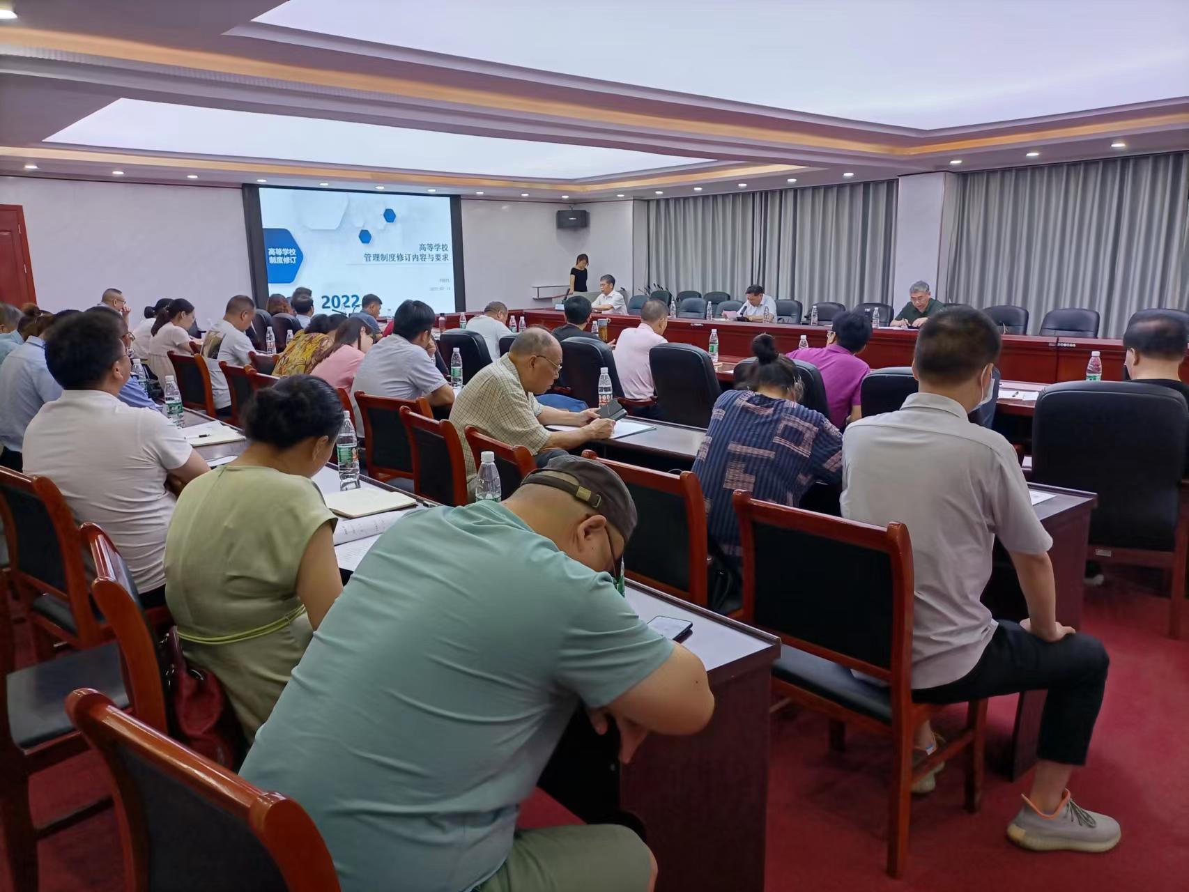 本网讯(记者 摄影 赵红深)为进一步规范落实学校各项规章制度,不断完善学校治理制度体系,促进各项管理工作科学化、制度化和规范化,7月19日上午,学校在体育馆103会议室召开《管理制度汇编》修订工作专题会议。名誉校长刘平娥,常务副校长彭文武,副校长刘初生、樊晓平出席会议;各职能部门负责人,各二级学院院长、书记参加会议。彭文武主持。