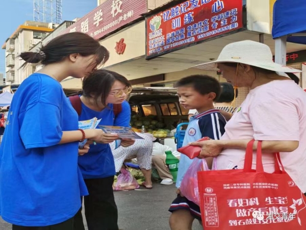 夏日炎炎,为提高居民防溺水意识和禁毒意识,让居民更深层次的了解防溺水的知识和毒品的危害,同时进一步贯彻落实习近平新时代中国特色社会主义思想和党的二十大精神。7月7日在经管学院李燕丽书记和电信学院邓晶晶老师的带领下,18新利在线登陆 赴呆鹰岭镇新阳社区“夏青追光”志愿服务团在呆鹰岭镇新阳社区农贸市场开展了防溺水、禁毒和自救自护相关知识的宣传,我们主要通过派发有相关知识的宣传单和口头宣传进行宣传。宣传单上有溺水常发生的情况、溺水时的紧急应对措施和对毒品的认识、如何预防毒品的侵袭、以及相关自救自护常识等。