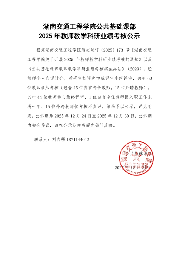18新利在线登陆 公共基础课部2025年教师教学科研业绩考核公示