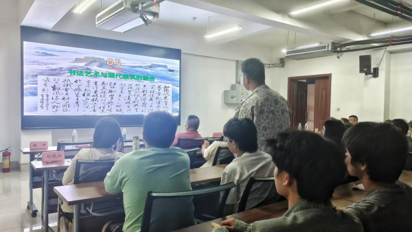 王神箭教授以苏州博物馆的飞檐设计为例,阐述书法中“行云流水”的线条美学如何转化为建筑轮廓的灵动感。随后,他面向台下学生抛出问题:“该书法与该意境相结合给你一种怎样的体会?”交通运输工程学院交运2401班的陈思妤立即举手回应:“王老师的案例让我联想到王羲之《兰亭序》中疏密有致的布局。现代建筑可以借鉴这种‘留白’手法,比如通过开放式庭院或镂空墙体,在实体结构中创造呼吸感,既保留功能性,又赋予空间文化意境。”王教授点头赞许,并补充道:“书法不仅是视觉艺术,更是空间与时间的流动记录。建筑的‘虚’可以体现为公共区域的灵活分隔,‘实’则通过材质与结构传递文化厚重感。