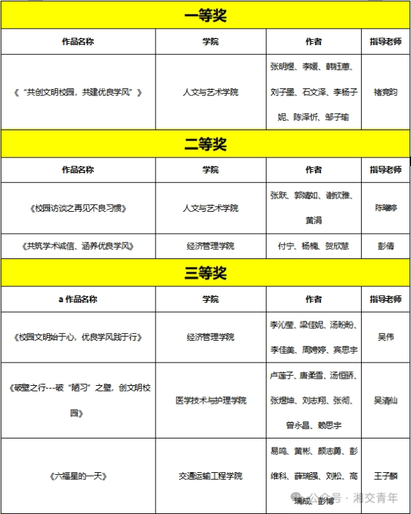 “共创文明校园,共建优良学风”短视频大赛得到了广大师生的广泛响应,共收到参赛作品64件。经学院初审、校团委复审、邀请专家老师组建评审团终审,从作品主题、创意、制作质量、教育意义等多个维度进行综合考量,最终评选出以下获奖作品及优秀指导老师。