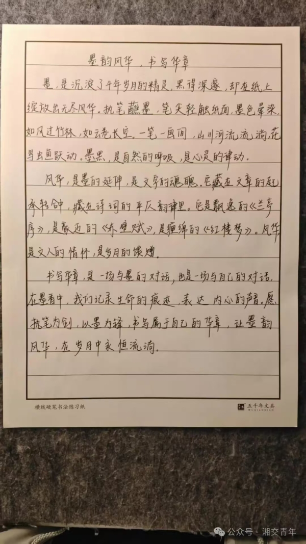书法是中华文化的重要组成部分,承载着数千年的历史与智慧。从甲骨文、金文到篆书、隶书、楷书、行书、草书,每一种书体都反映了不同历史时期的文化特征和审美观念。书法不仅是文字的记录,更是文化的传承。为了弘扬传统文化,激发文化自信,营造浓厚的艺术氛围,同时为湖南省第十一届青年文化艺术节遴选参赛人员,我校举办此次主题为墨韵书法书写华章的书法大赛。