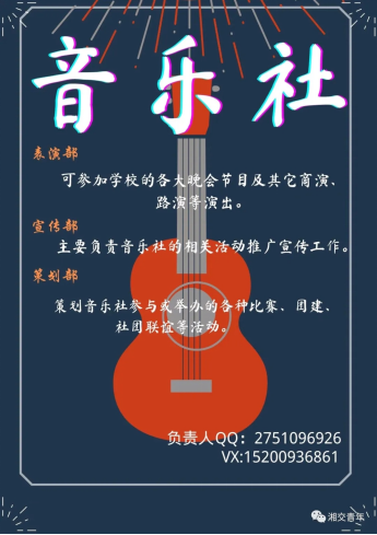 音乐社是音乐爱好者交流的平台,兼顾学校的艺术表演任务,逐步开展歌唱交流比赛等其他活动。社团包括表演部、策划部、宣传部,我社欢迎所有对音乐感兴趣的小伙伴加入,不管是否会唱歌,只要有一颗热爱音乐的心就可以加入我们!