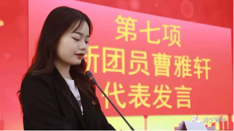入团介绍人代表胡家怡宣读了团章中有关团员的义务和权利的条款,让新发展团员对自己的责任与义务有了更清晰的认识;老团员代表校团委组织部段明丽发言,在发言中,段明丽同学分享了自己身为团员的一些体会,对于如何成为一名优秀团员做出解答;新团员代表曹雅轩阐述了自己对于团员身份与使命的理解,对自己立下成为优秀团员的目标。